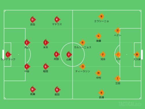 1.スタメンと配置 2.エスパルスの守備局面について 3.清水の攻撃局面について 4.後半の流れ 5.まとめ 1.スタメンと配置 ・清水エスパルスのシステムは1-4-2-3-1 左ウイングは久々に西澤がベンチスタートでドゥトラがスタメン。センターバックは川崎戦欠場し…