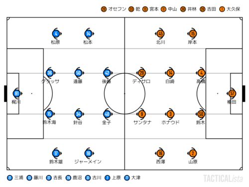 両チームのメンバーと基本フォーメーション 清水のビルドアップと磐田の守備 清水がボールを持つと明確な配置を取り前進を狙っていた。 白崎が降りて相手2トップに対して後ろ3枚。ディサロと西澤は相手のボランチの脇に絞り、大外に両サイドバックが上がる。…